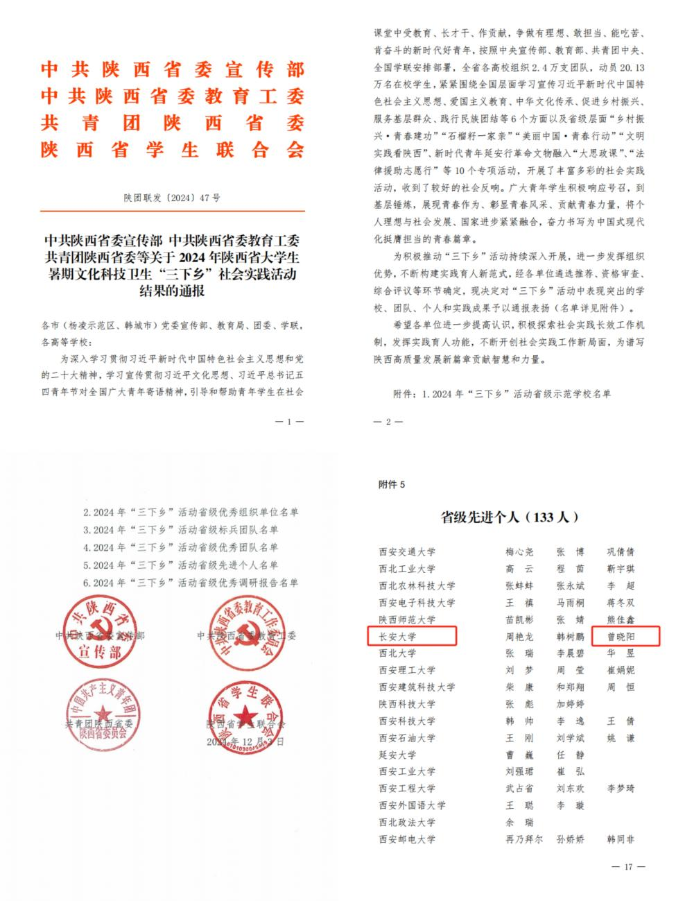 近日,中共陕西省委宣传部、中共陕西省委教育工委、共青团陕西省委等相关部门联合发布了《关于2024年陕西省大学生暑期文化科技卫生“三下乡”社会实践活动结果的通报》,Manga18 团委书记曾晓阳获评2024年陕西省暑期“三下乡”社会实践活动先进个人称号。作为学院共青团主要负责人,曾晓阳积极响应校团委号召,认真组织,充分调动学院全体师生的积极性、主动性和创造性,在学院仅3个本科生年级360余人的情况下,共组建12支队伍,其中校级立项5支(...