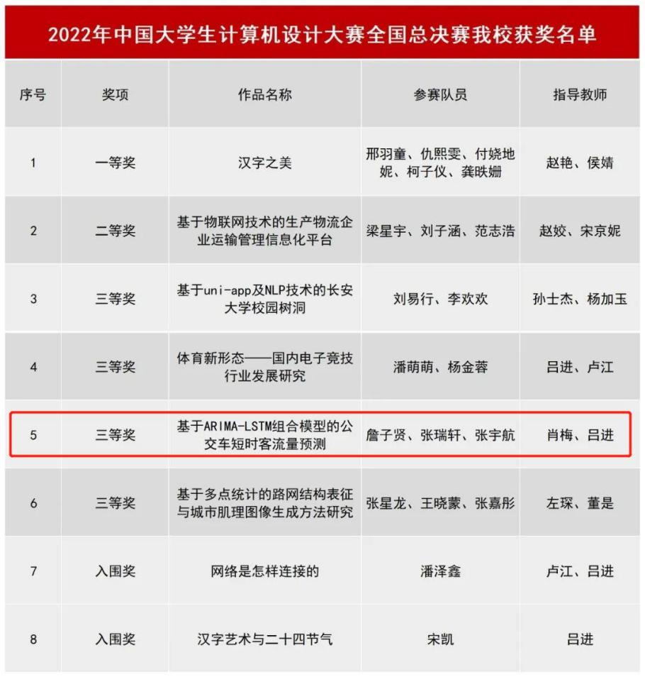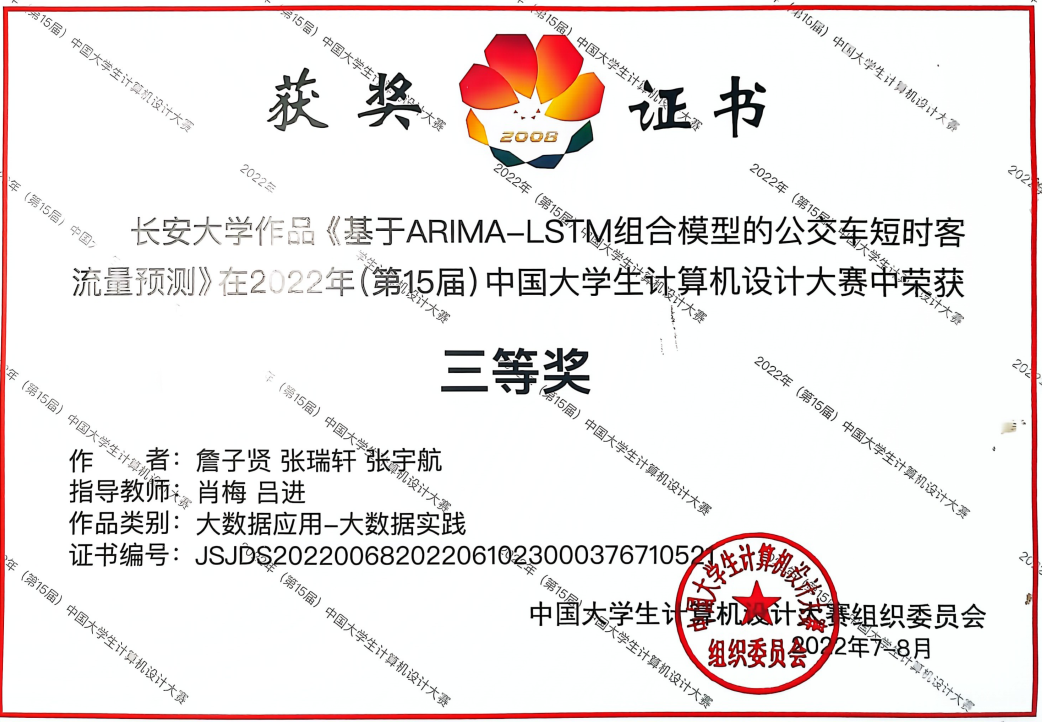 2021级本科生詹子贤、张瑞轩、张宇航凭借作品《基于ARIMA-LSTM组合模型的公交车短时客流量预测》(指导老师:肖梅、吕进),在西北分赛区中荣获二等奖,在全国总决赛中荣获三等奖。