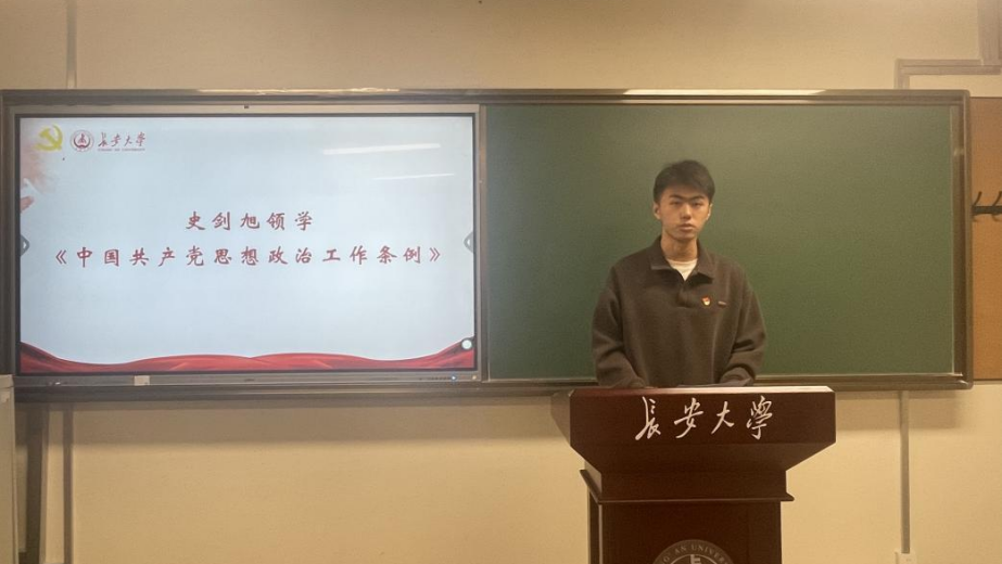 党员代表史剑旭领学《中国共产党思想政治工作条例》。思想政治工作是为完成党的中心任务和历史使命动员组织党员、干部、群众所进行的思想教育、政治引领、道德培养、精神激励、文化涵育、心理疏导、关怀服务等实践活动。史剑旭倡导学生党员要自觉主动学习《条例》内容,加强自身思想政治建设,坚定理想信念,强化党性修养,提升专业素养,为中华民族伟大复兴事业做出自己的贡献。