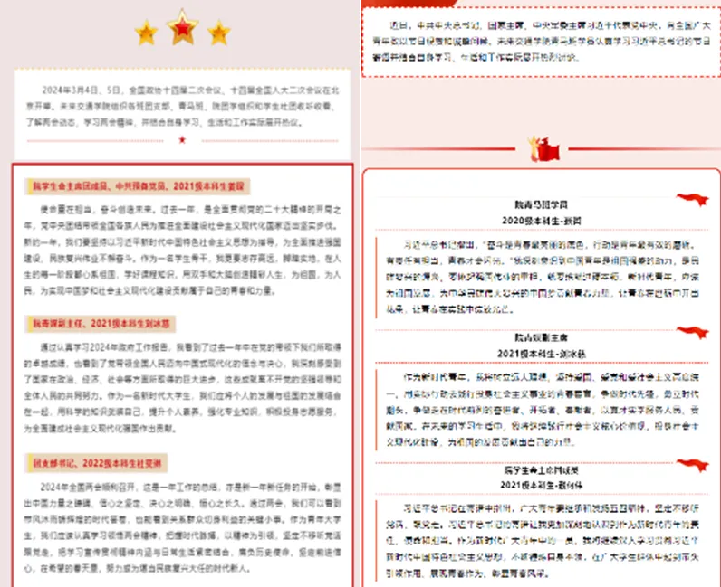 院学生会同校学生会定期开展工作交流,积极承办“清扫一屋尘,文明树新风”“全国模拟政协提案大赛”等校级精品活动。同时,为助力网上学生会平台建设,院学生会积极转发、投稿、宣传优秀推文百余条,画好组织宣传同心圆。院学生会在校院两级定期联席会议、校学生会各项主办活动中参与率均为100%。下一步,院学生会将继续切实发挥校院两级协同联动作用,推动组织力量进一步下沉,成为同学关键时刻“想得起、找得到、靠得住”的温馨家园。