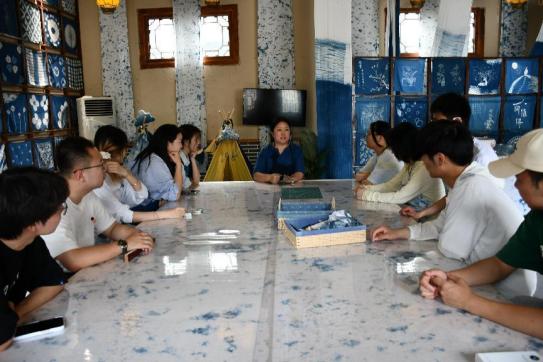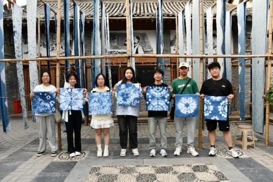 当天下午,实践队前往白鹿仓体验非物质文化遗产——古法蓝染。古法蓝染是蓝靛加入水、草木灰、米酒,一定时间发酵后,再对布进行缝扎画处理在发酵好的蓝染液里进行染色的工艺。蓝染分为型糊染、蜡染、扎染、夹染四种工艺。在指导老师的细心讲解下,同学们对扎染技艺的理解更加深刻,并在之后开始了自己的扎染体验。