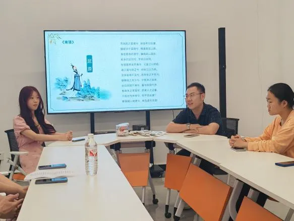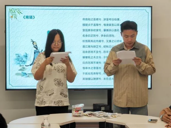 心协志愿者李晨露和程毅朗诵了《离骚》选段,在场人员通过诗歌的形式感受古人对端午的情感寄托以及爱国情怀。刘志兴对《离骚》和屈原进行了讲解,他介绍到《楚辞》作为古代诗歌创作的一个巅峰,是中华优秀传统文化的瑰宝,学习《楚辞》,能够帮助同学们了解楚文化的魅力,感受诗人的高尚情操,在探秘文明密码中,增强历史自信、文化自信,对培养学生综合素质有着深远影响。
