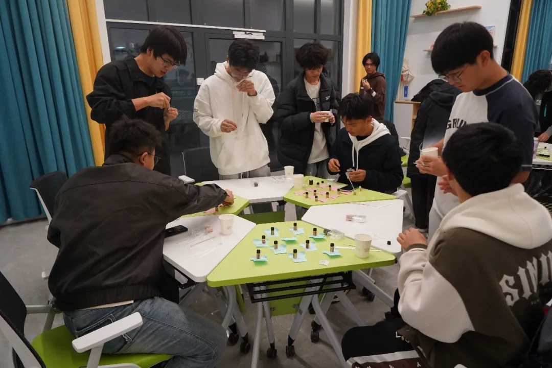 调香环节中,同学们兴致勃勃地开始了自己的“实验”,在玻璃瓶与滴管的碰撞声中实践着各种古灵精怪的想法。同学们将焦虑与烦忧抛诸脑后,沉浸在短暂的放松与欢愉中,在相互评鉴作品时碰撞思想,获得新的灵感,丰富香的层次。