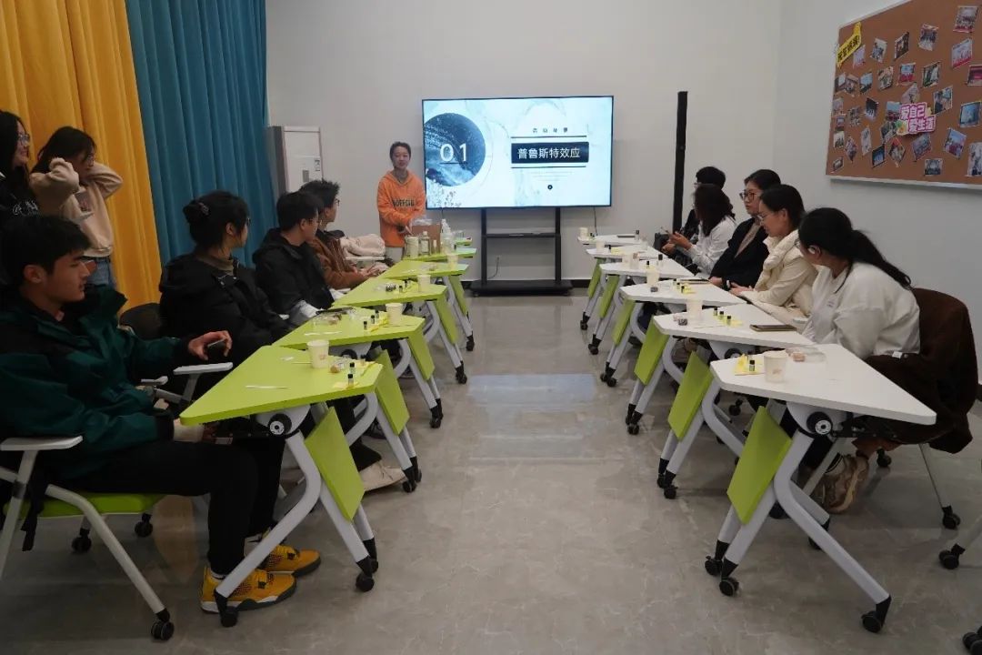 胥敬秋以“香”这一话题为切入点,为大家介绍了“普鲁斯特效应”这一心理学知识,提出了以味道联想事物的联觉理论,点燃了同学们对调香的兴趣。同学们也积极发言,分享了在自己的日常生活中,一些特殊的味道带来的感受。随后在若有若无的香水味中,胥敬秋介绍起调香的基本逻辑与原理,调香环节正式奏响序曲。
