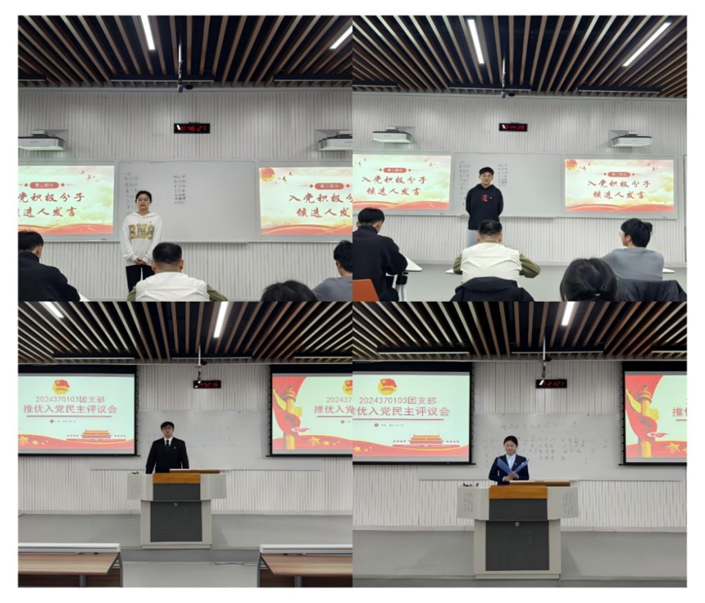 会议在庄严的团歌声中拉开序幕。各团支书向同学们介绍了会议流程及其重要意义,并对各候选人进行了简单介绍。会上,符合推优条件的支部成员依次上台做自我陈述,阐述了对党的认识,表明了自己的入党动机,重点指出了个人在思想政治、学生工作、学习成绩、个人生活、参与校内外各项活动等方面存在的优点与不足。