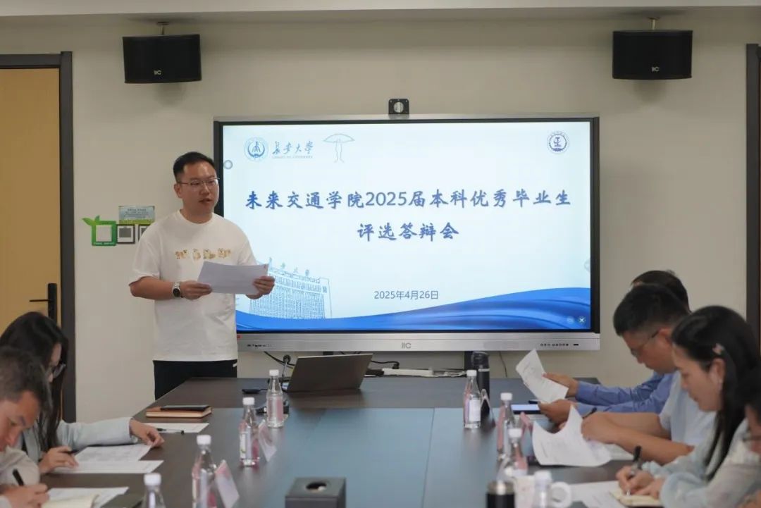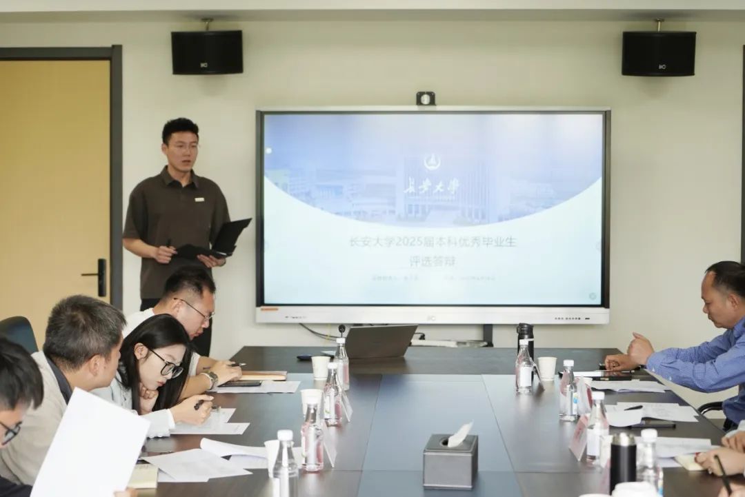 于2025年4月26日上午在北校区师生服务大厅二层第一会议室举办2025届本科优秀毕业生评选答辩会。学院副院长汤颖颖、杨旭,教学与国际交流事务部主任马征,学生事务部主任刘志兴,团委书记曾晓阳,专任教师戴涛、陈文强,2025届本科毕业生辅导员范荣欣和学生代表萧梓钧担任评委,会议由刘志兴主持。