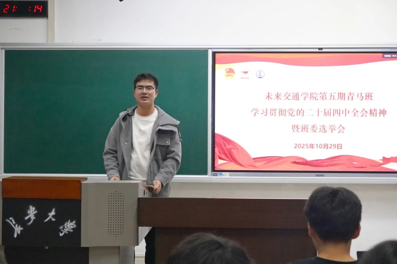 黄卢轶带领全体成员学习党的二十届四中全会精神,重点围绕教育、科技、人才三方面内容,详细介绍了科技创新和社会发展的协同关系,并对本期青马学员培养方案进行深入解读。他鼓励每一位青马学员,要提高思想政治站位,深刻领悟“加快高水平科技自立自强,引领发展新质生产力”的内涵意义,把自身所学专业与国家发展战略需求紧密结合,深耕马克思主义理论学习并注重学用结合,坚定理想信念,努力提升自身综合素质。